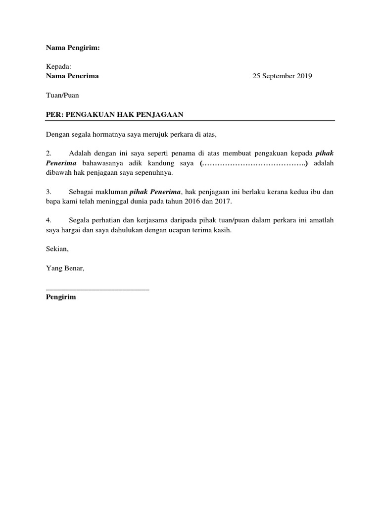 Contoh Surat Hak Penjagaan Anak Letter 7saudara Com
